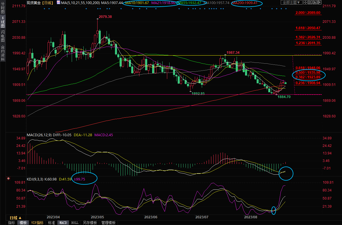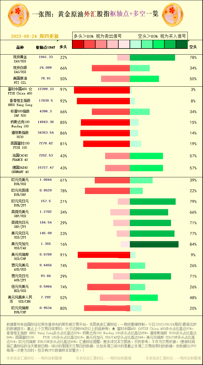 一张图:2023/08/24黄金原油外汇股指"枢纽点+多空占比"一览