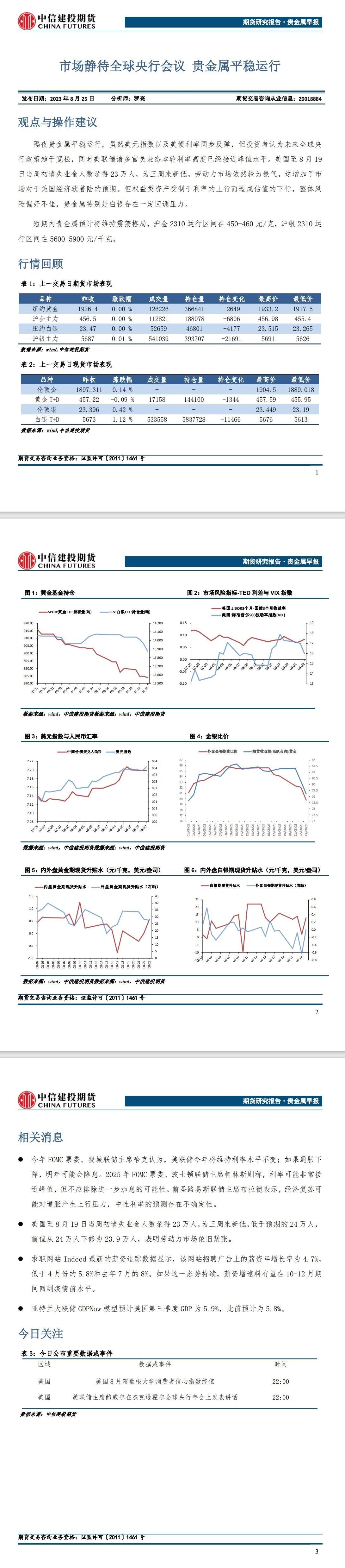 中信建投期货8月25日贵金属报告:市场静待全球央行会议 贵金属平稳运行
