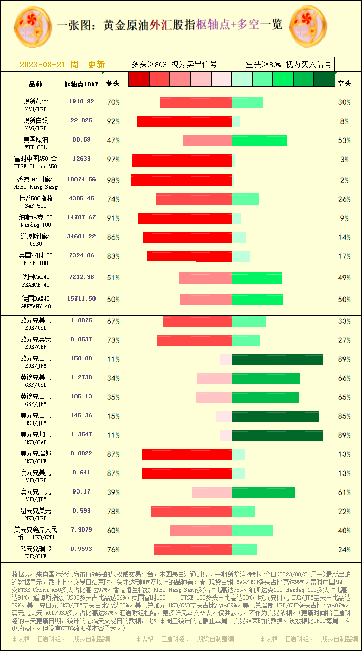 一张图:2023/08/21黄金原油外汇股指"枢纽点+多空占比"一览