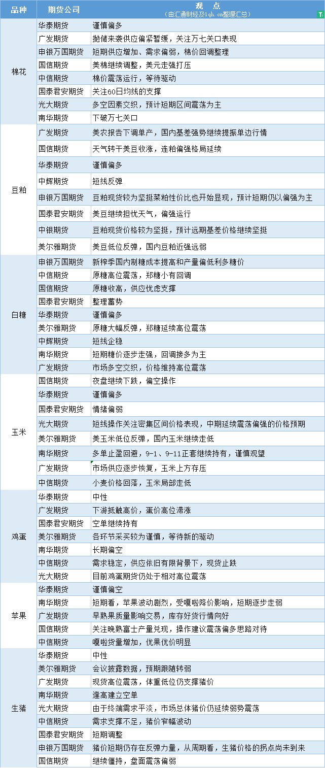 期货公司观点汇总一张图:8月17日农产品(棉花、豆粕、白糖、玉米、鸡蛋、生猪等)
