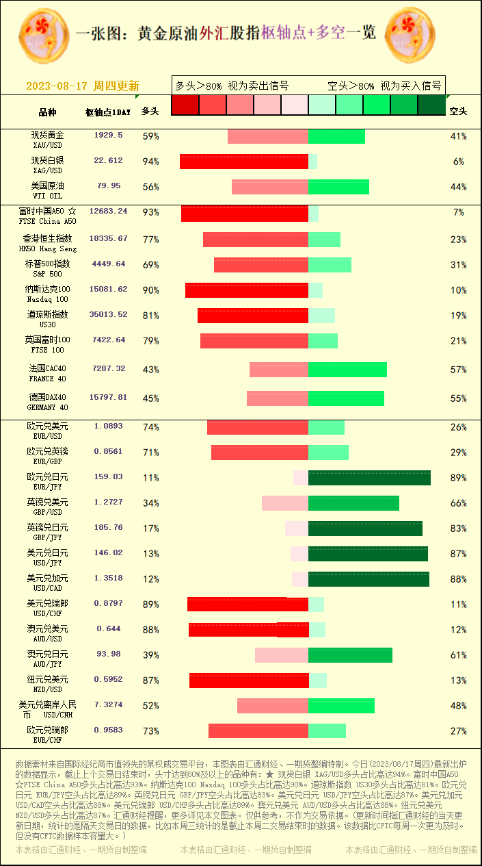 一张图:2023/08/17黄金原油外汇股指"枢纽点+多空占比"一览