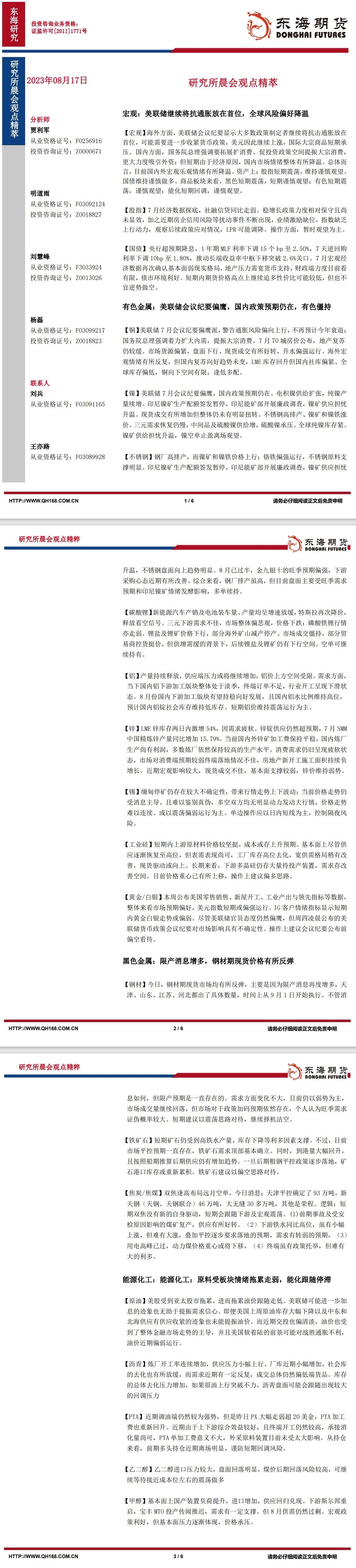 【东海期货8月17日研究所晨会观点精萃】:美联储继续将抗通胀放在首位,全球风险偏好降温