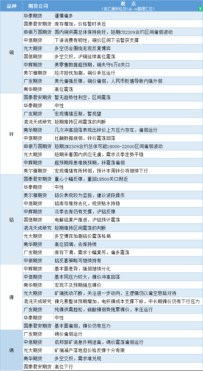 期货公司观点汇总一张图:8月16日有色系(铜、锌、铝、镍、锡等)