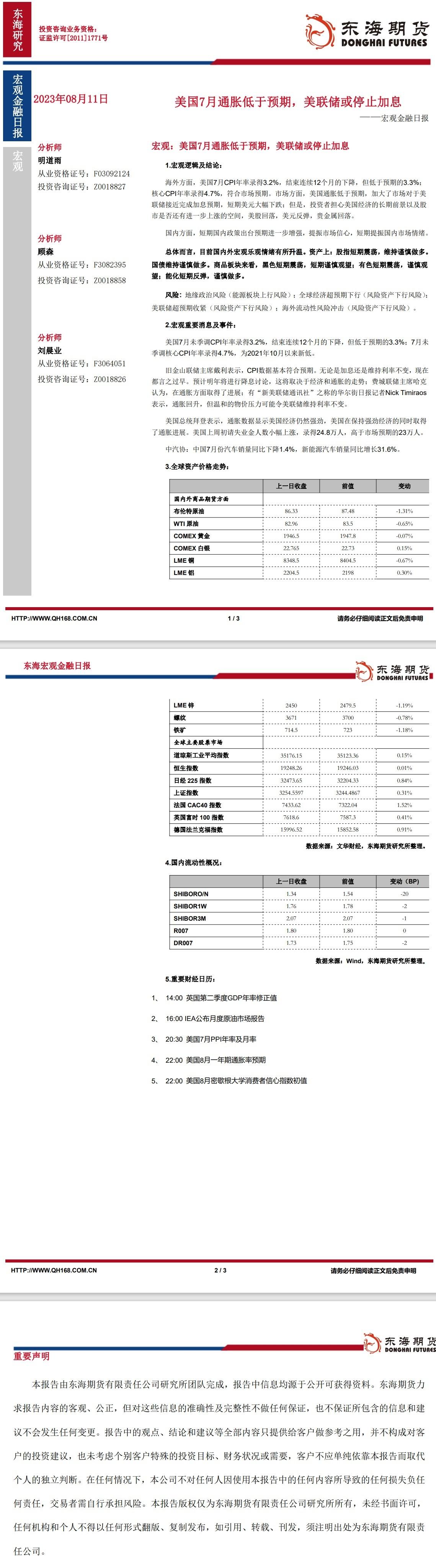 【东海期货8月11日宏观金融日报】:美国7月通胀低于预期,美联储或停止加息