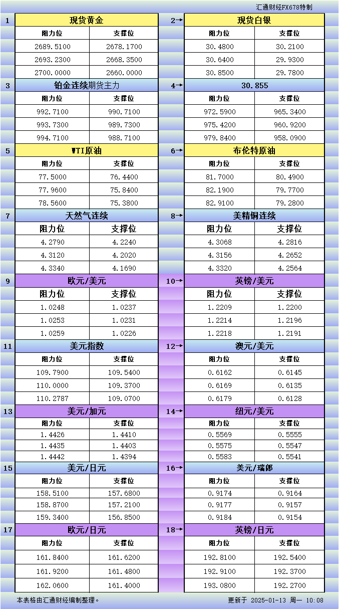 一张图看18个直盘外汇支撑阻力:美元+欧系日系+商品货币+新兴货币(2025/01/13)