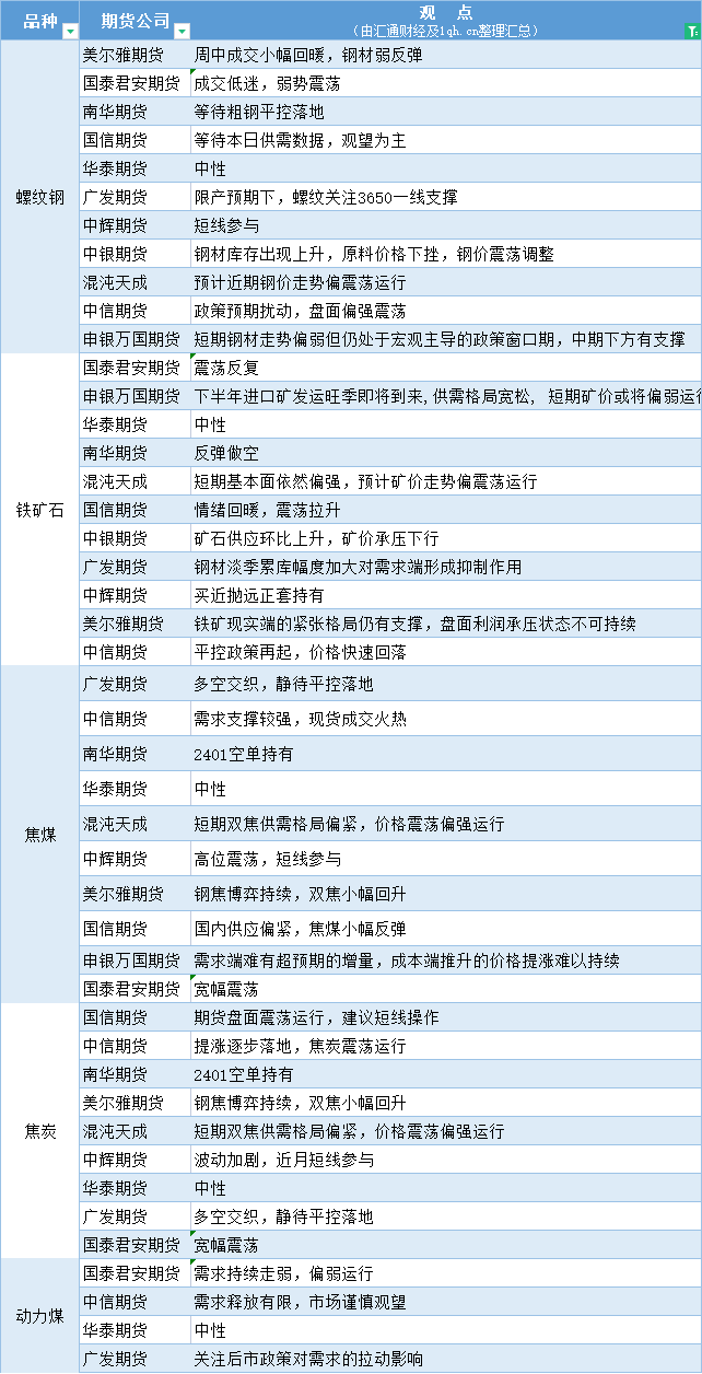 期货公司观点汇总一张图:8月10日黑色系(螺纹钢、焦煤、焦炭、铁矿石、动力煤等)