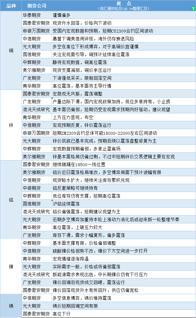 期货公司观点汇总一张图:8月8日有色系(铜、锌、铝、镍、锡等)