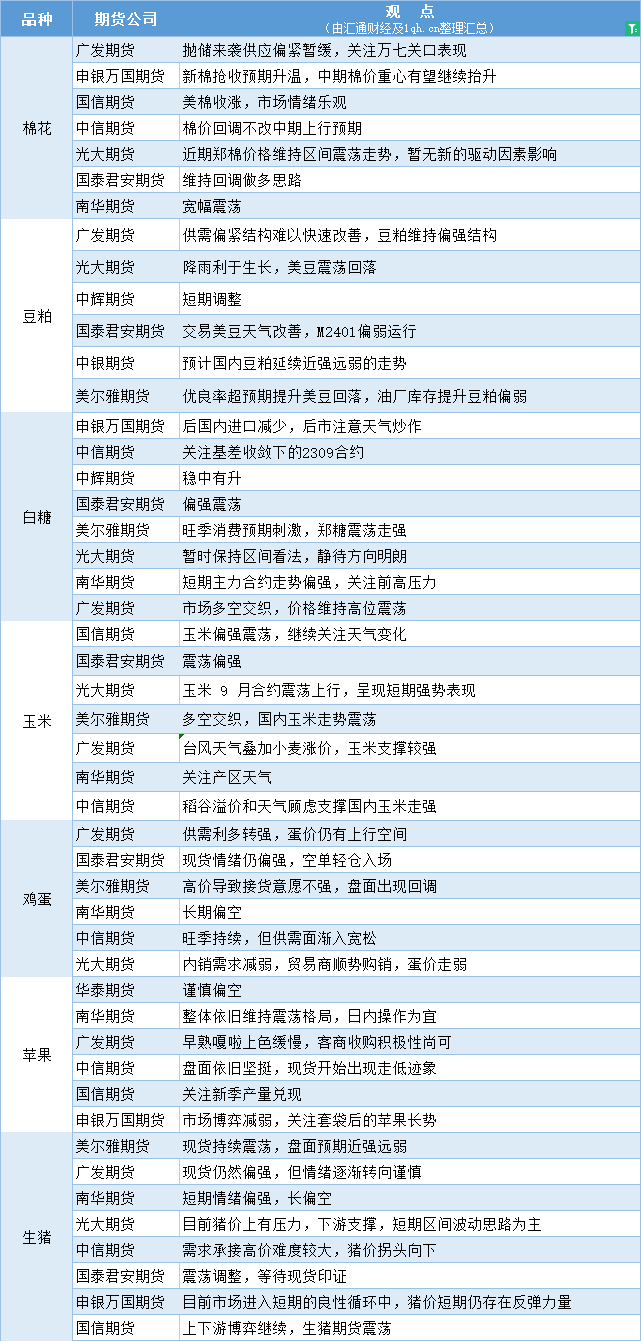 期货公司观点汇总一张图:8月8日农产品(棉花、豆粕、白糖、玉米、鸡蛋、生猪等)