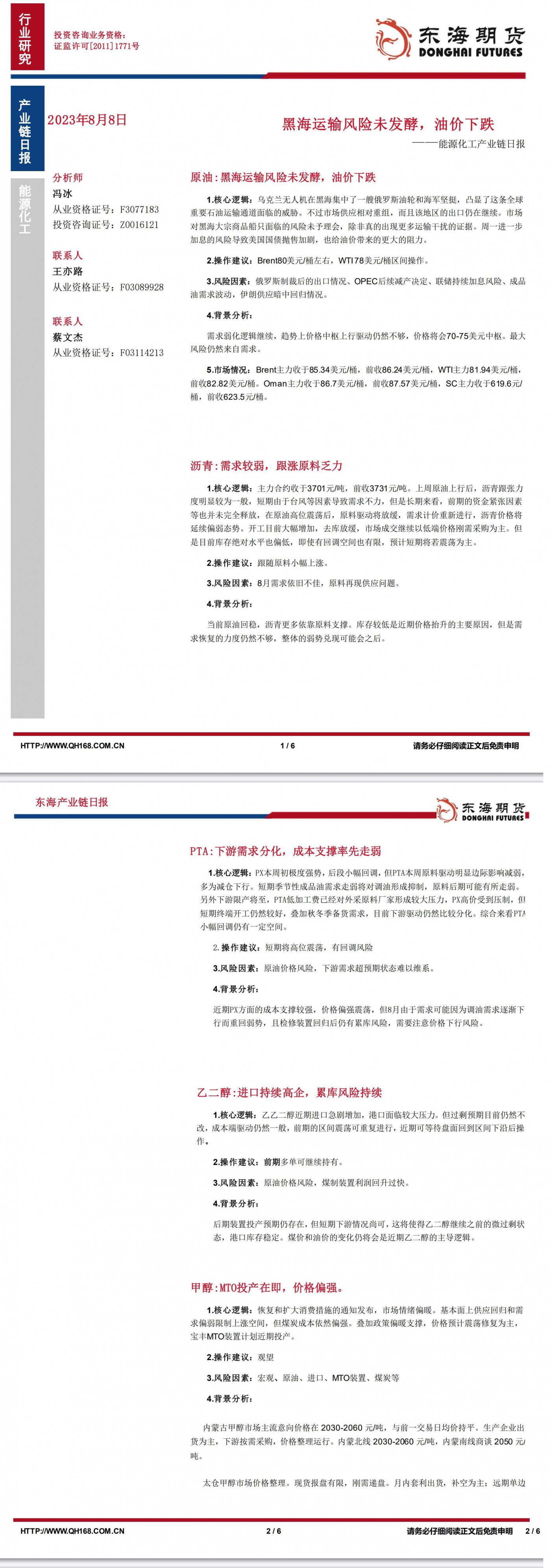【东海期货8月8日产业链日报】能化篇:黑海运输风险未发酵,油价下跌