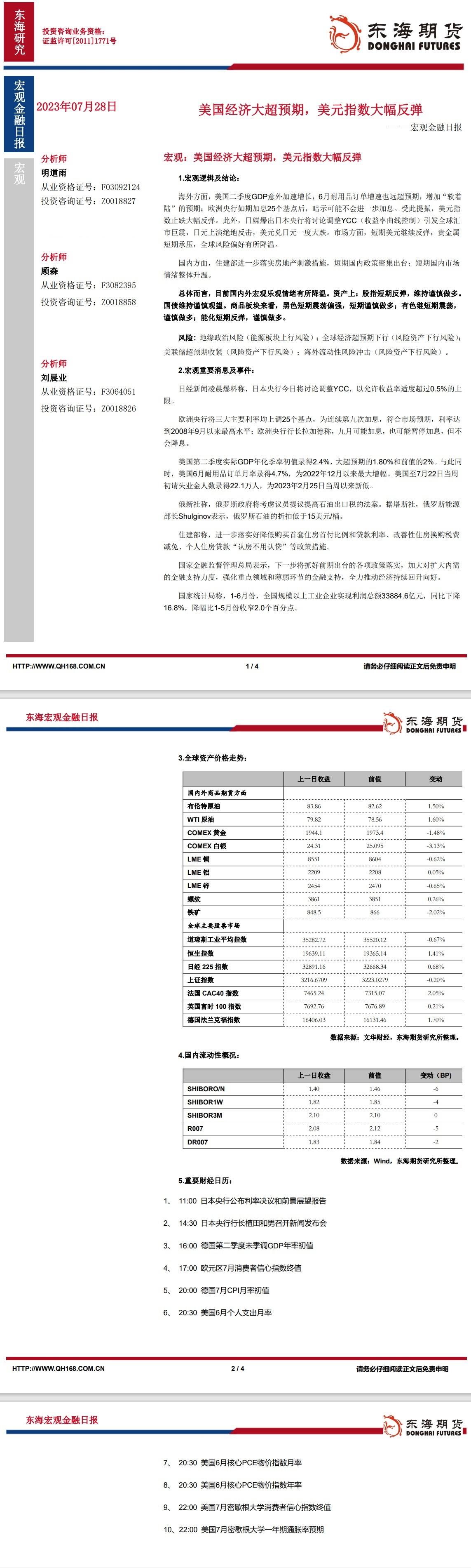 【东海期货7月28日宏观金融日报】:美国经济大超预期,美元指数大幅反弹