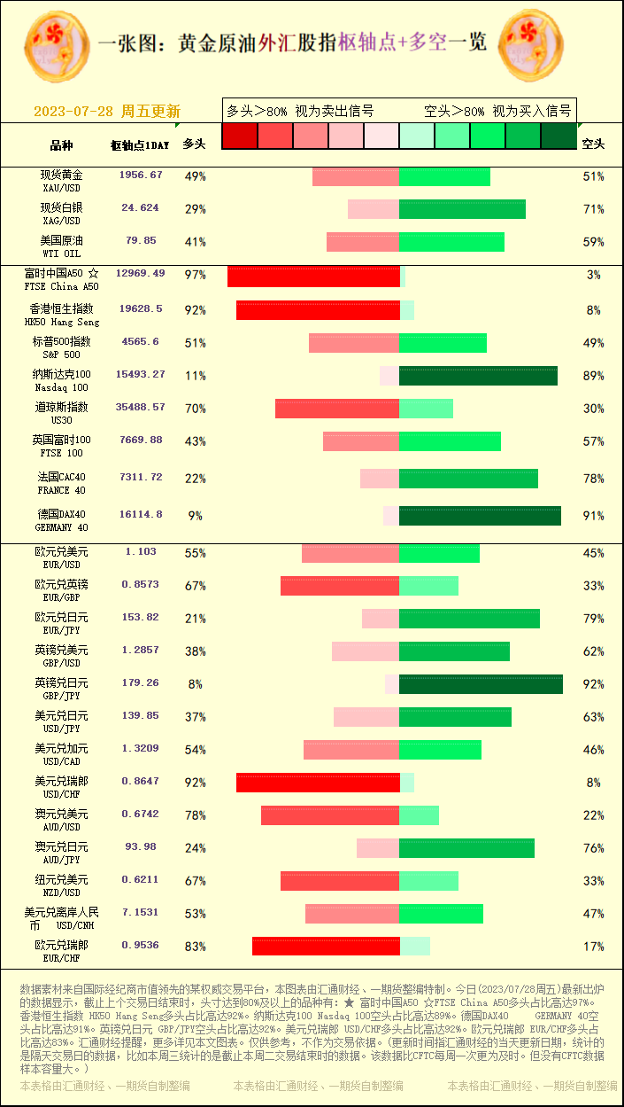 一张图:2023/07/28黄金原油外汇股指"枢纽点+多空占比"一览