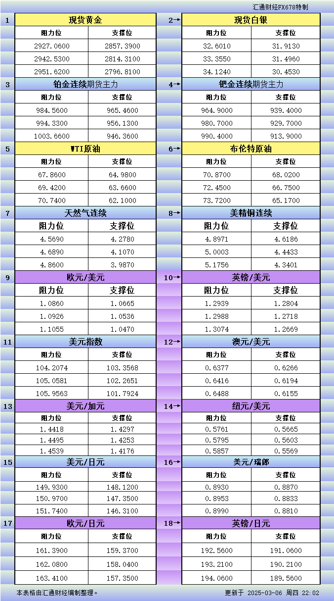 3月6日美市更新支撑阻力:18品种支撑阻力(金银铂钯原油天然气铜及十大货币对)