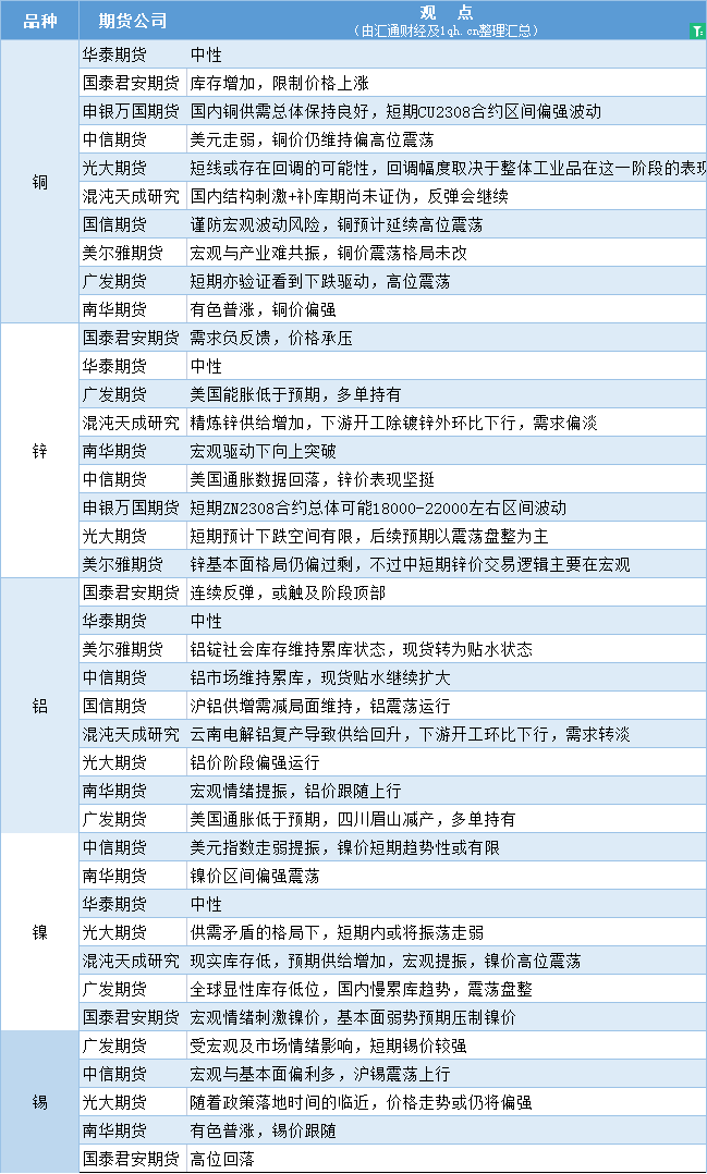 期货公司观点汇总一张图:7月17日有色系(铜、锌、铝、镍、锡等)
