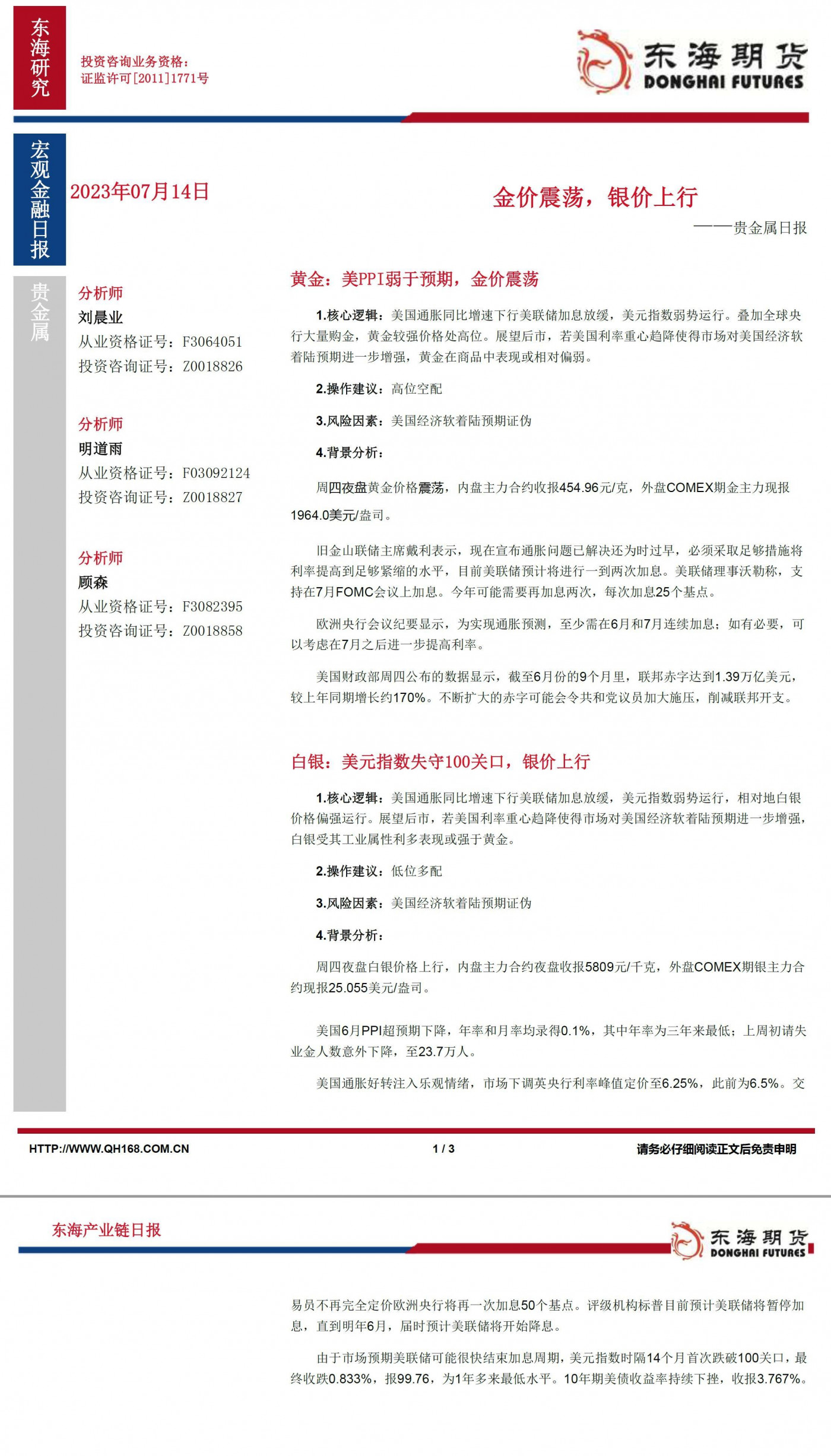 【东海期货7月14日产业链日报】贵金属篇:金价震荡,银价上行