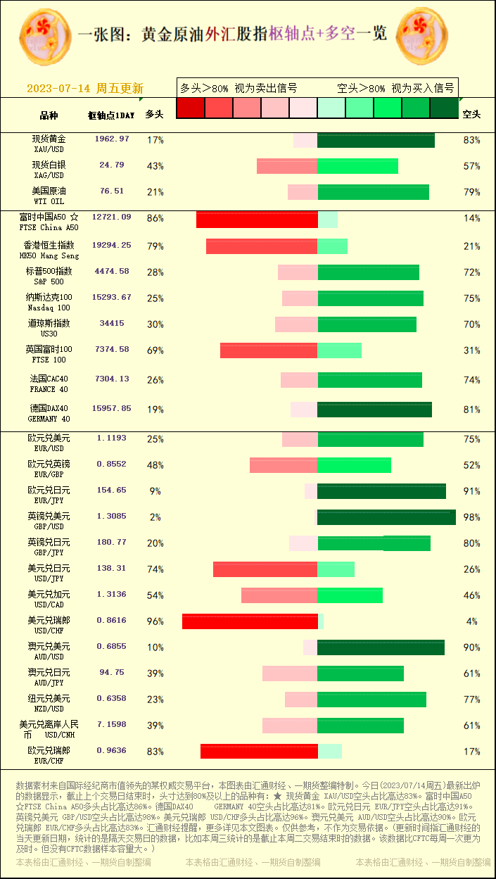 一张图:2023/07/14黄金原油外汇股指"枢纽点+多空占比"一览