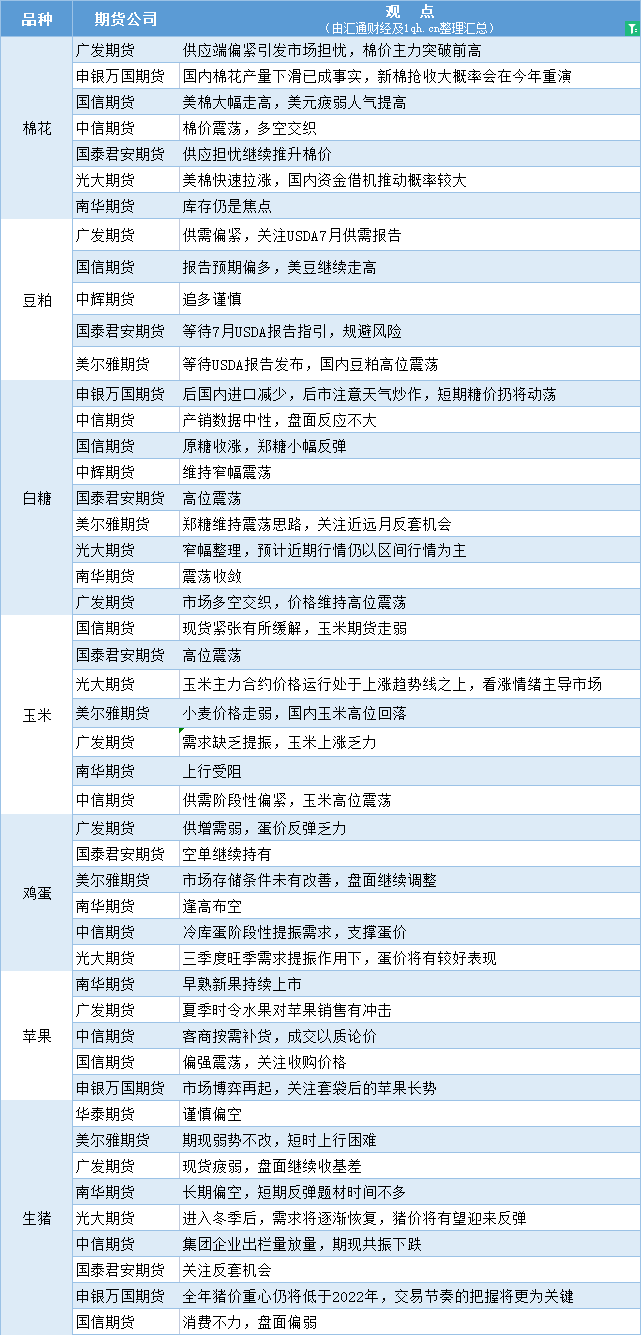期货公司观点汇总一张图:7月12日农产品(棉花、豆粕、白糖、玉米、鸡蛋、生猪等)