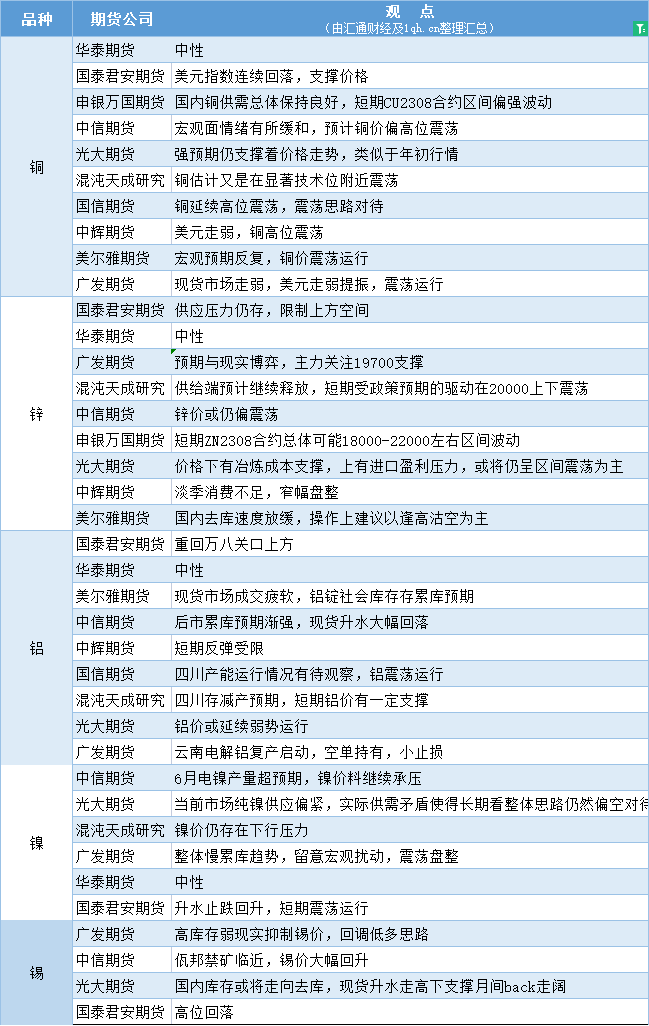 期货公司观点汇总一张图:7月11日有色系(铜、锌、铝、镍、锡等)