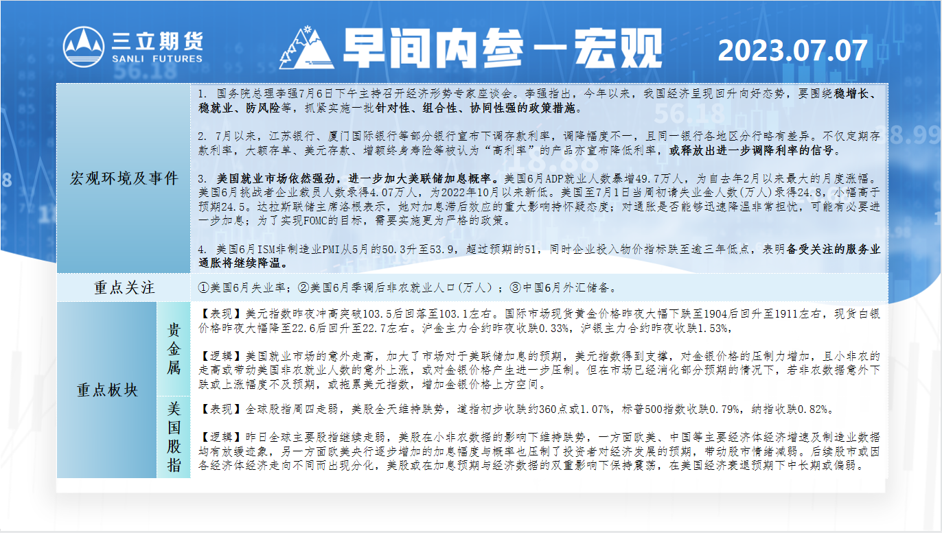 三立期货7月7日早间内参——宏观