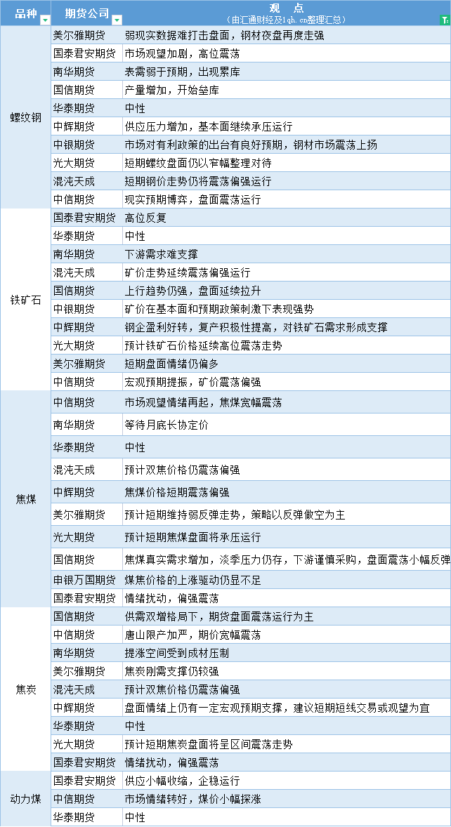 期货公司观点汇总一张图:6月30日黑色系(螺纹钢、焦煤、焦炭、铁矿石、动力煤等)