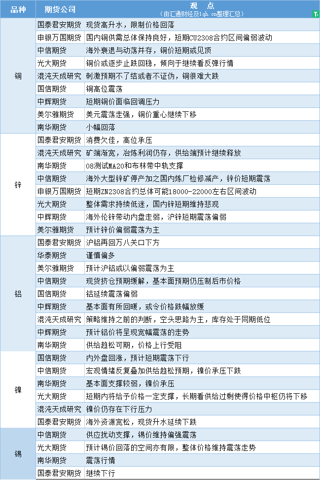 期货公司观点汇总一张图:6月30日有色系(铜、锌、铝、镍、锡等)