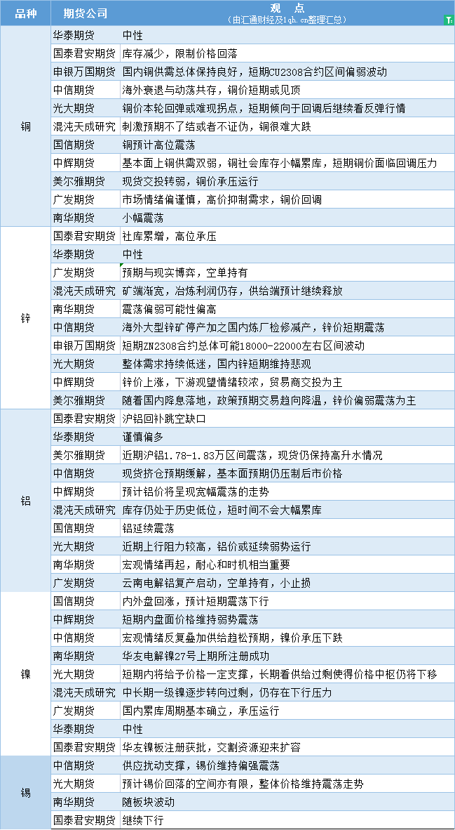 期货公司观点汇总一张图:6月28日有色系(铜、锌、铝、镍、锡等)