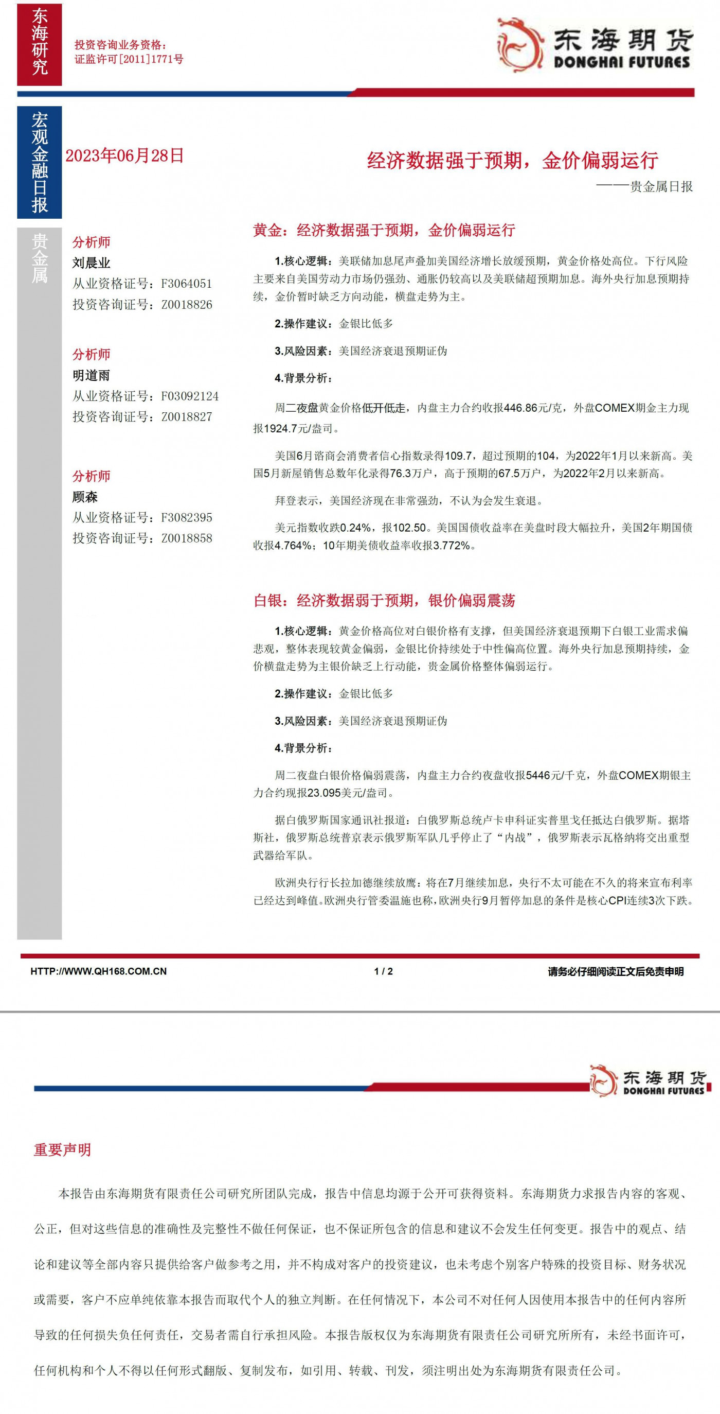 【东海期货6月28日产业链日报】贵金属篇:经济数据强于预期,金价偏弱运行