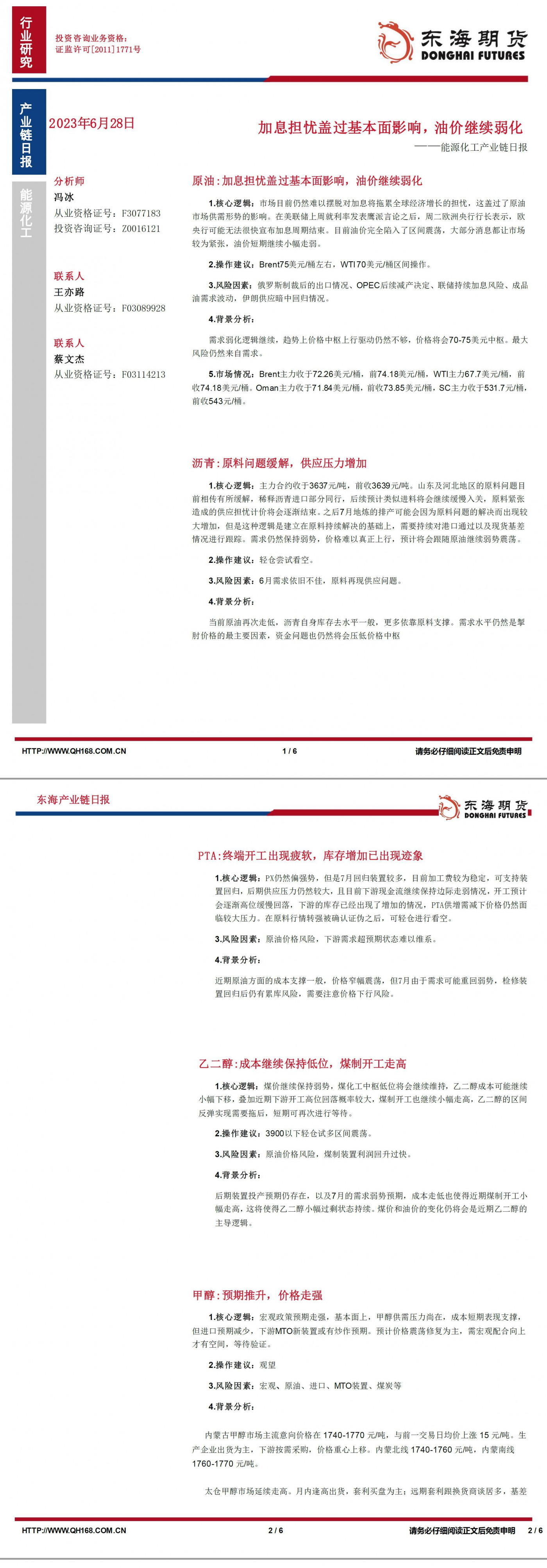 【东海期货6月28日产业链日报】能化篇:加息担忧盖过基本面影响,油价继续弱化