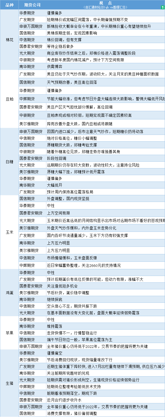 期货公司观点汇总一张图:6月26日农产品(棉花、豆粕、白糖、玉米、鸡蛋、生猪等)
