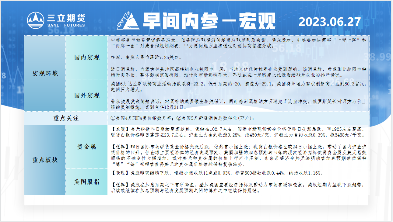 三立期货6月27日早间内参——宏观