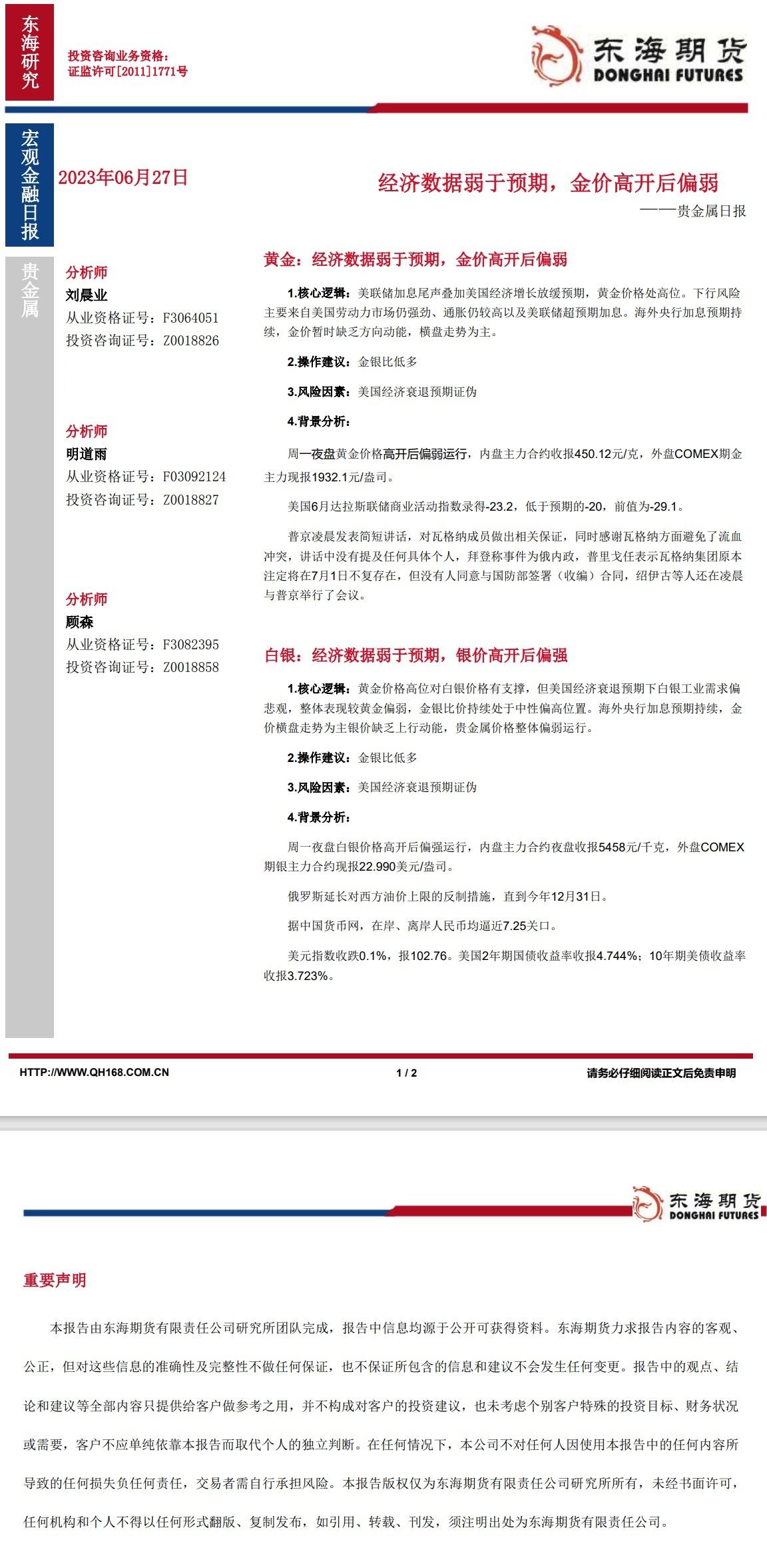 【东海期货6月27日产业链日报】贵金属篇:经济数据弱于预期,金价高开后偏弱