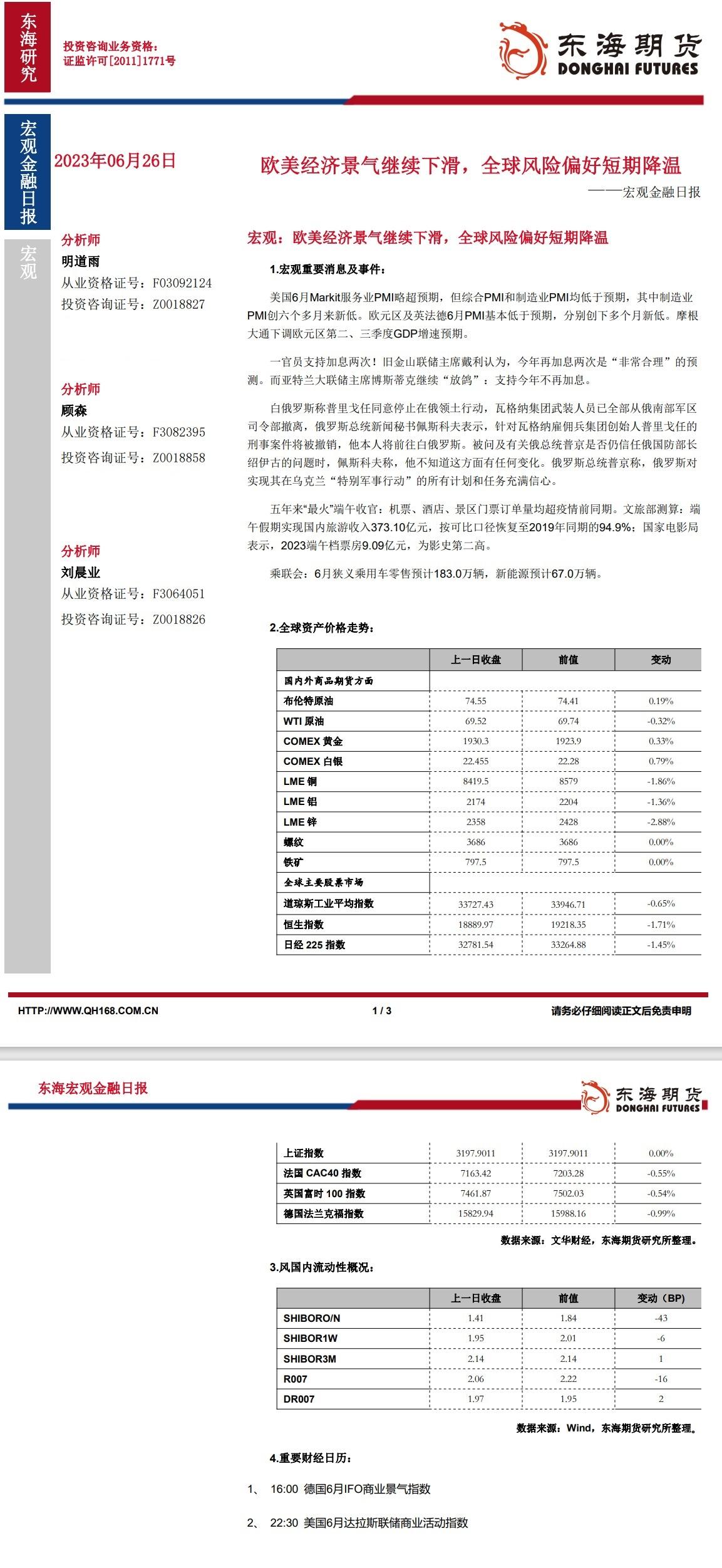 【东海期货6月26日宏观金融日报】:欧美经济景气继续下滑,全球风险偏好短期降温