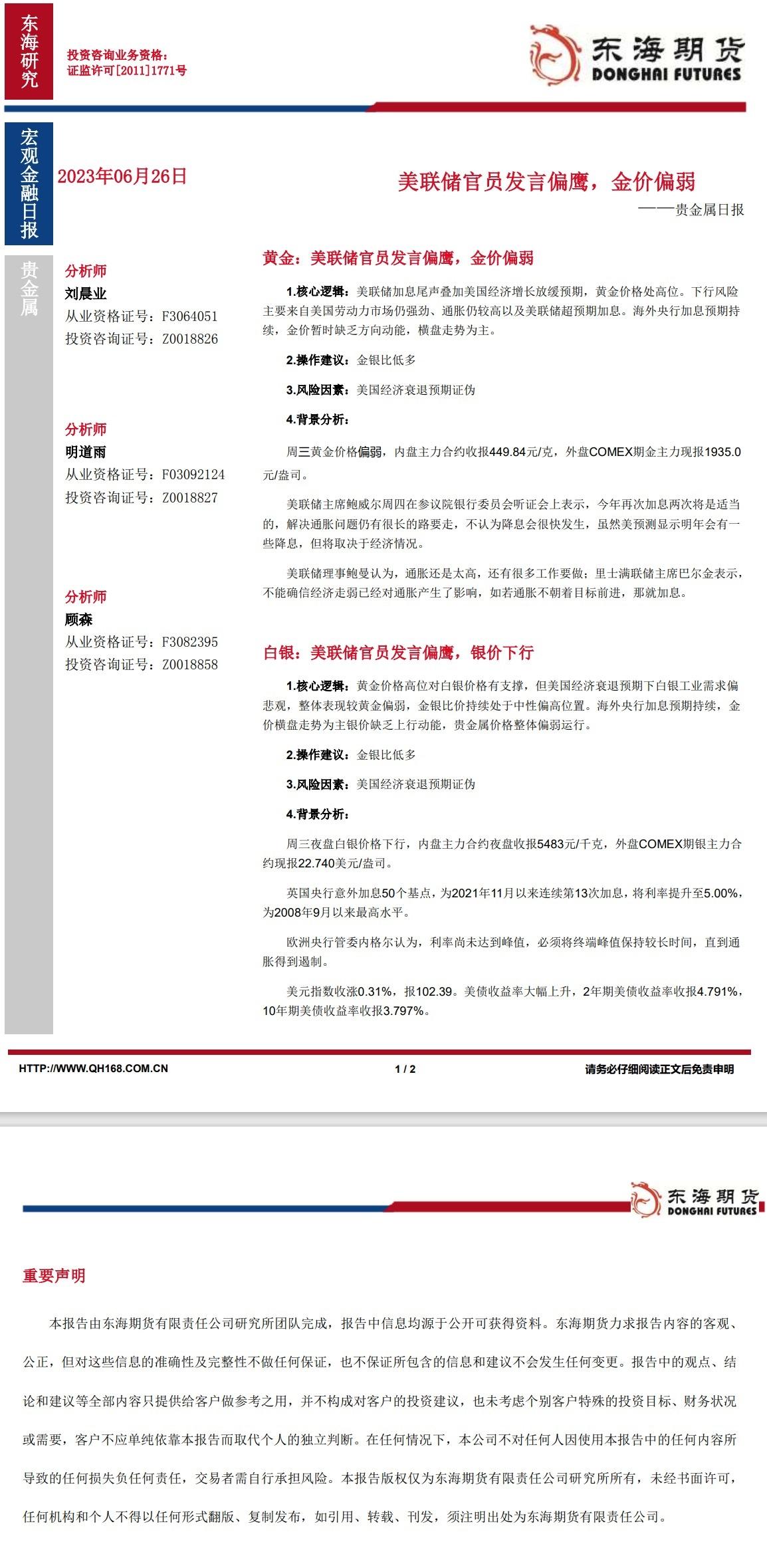 【东海期货6月26日产业链日报】贵金属篇:美联储官员发言偏鹰,金价偏弱