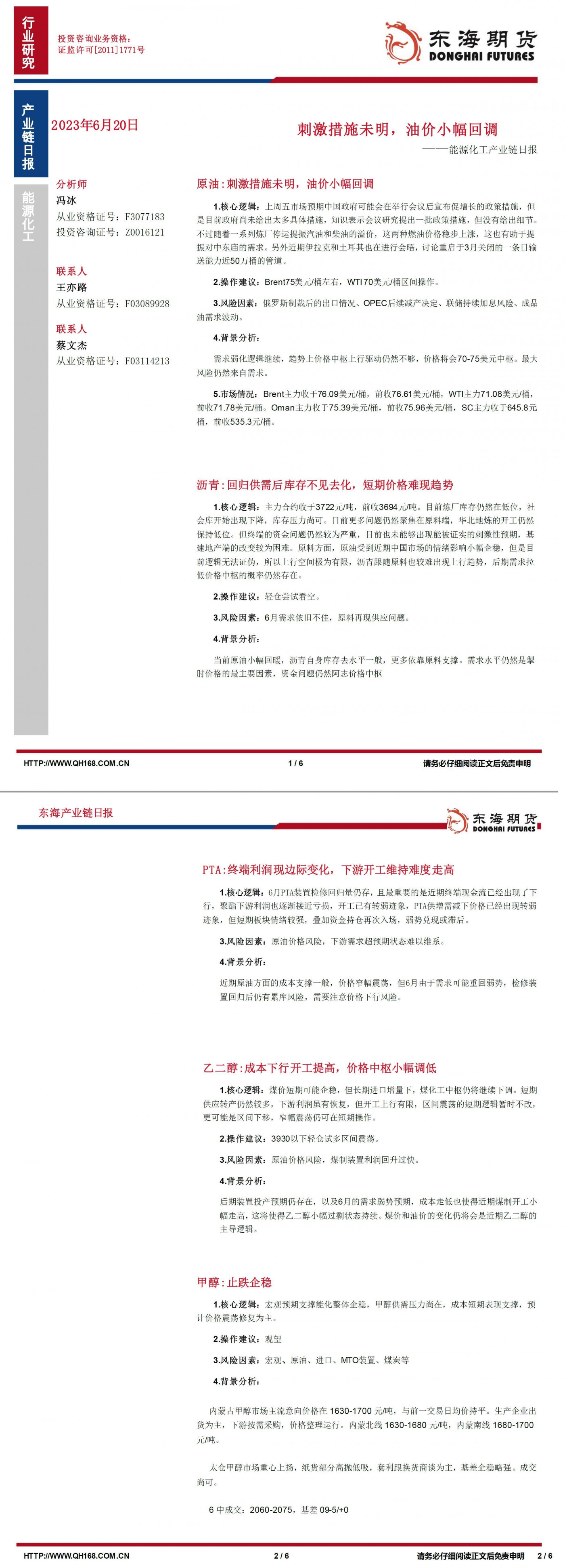 【东海期货6月20日产业链日报】能化篇:刺激措施未明,油价小幅回调