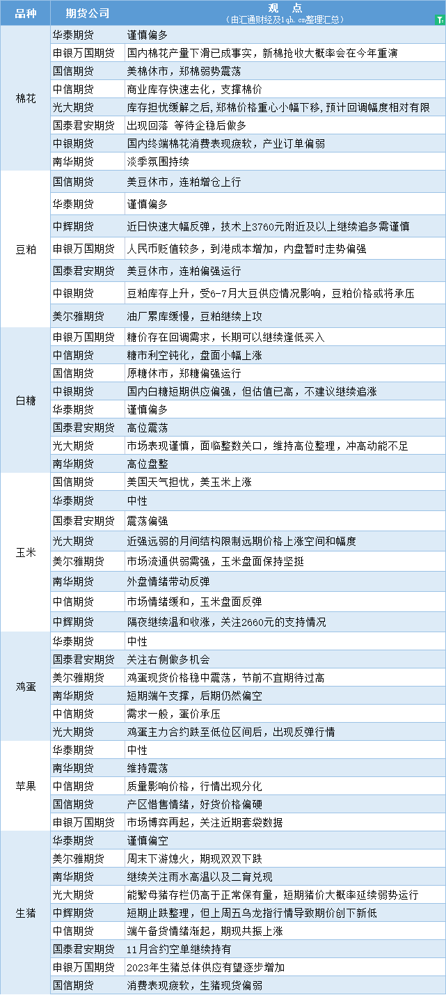 期货公司观点汇总一张图:6月20日农产品(棉花、豆粕、白糖、玉米、鸡蛋、生猪等)