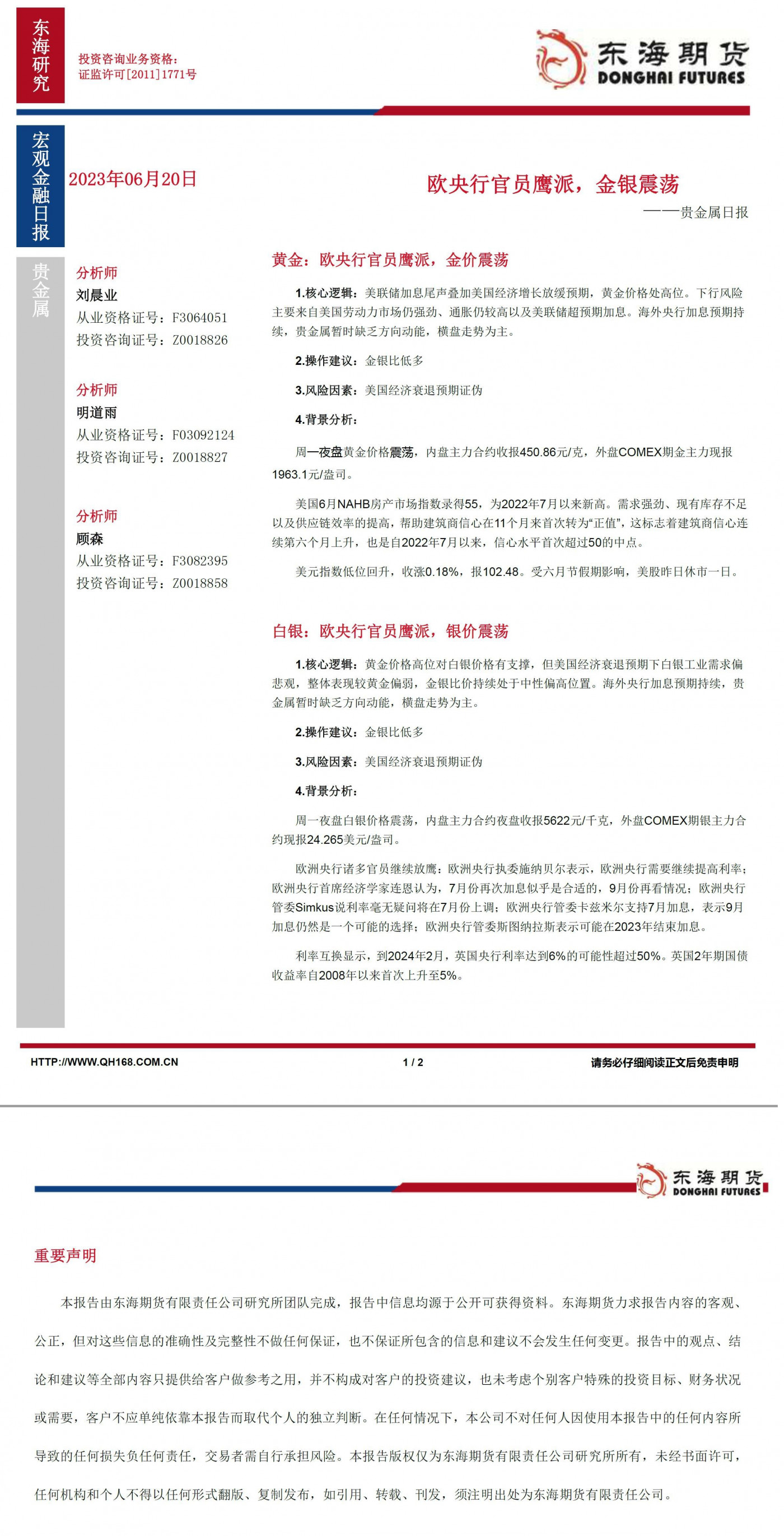 【东海期货6月20日产业链日报】贵金属篇:欧央行官员鹰派,金银震荡