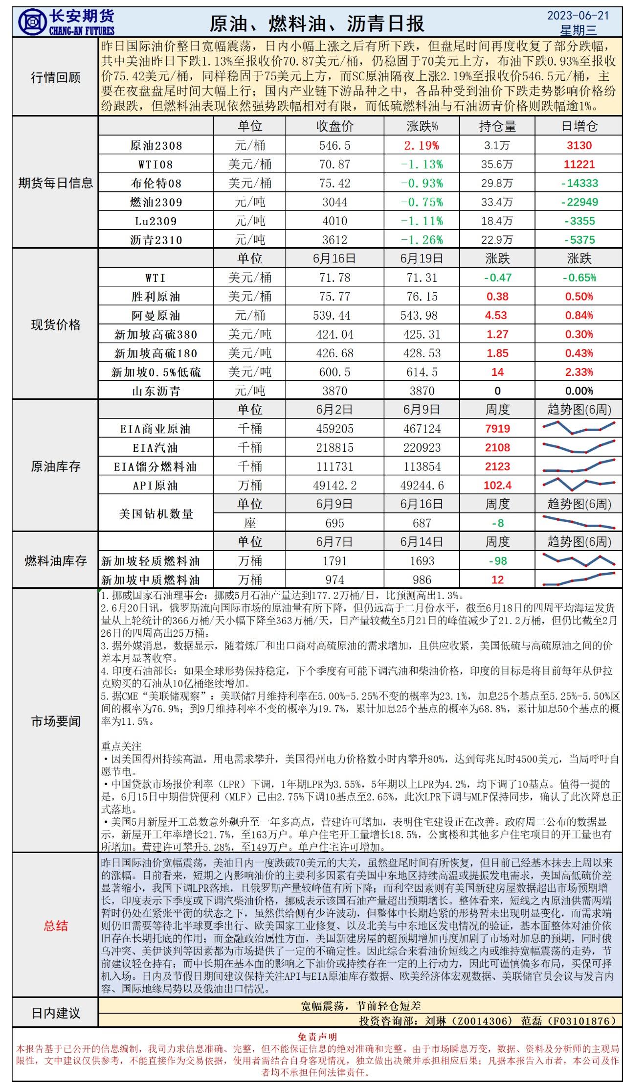 长安期货6月20日原油日报:节前消息平稳过渡,油价震荡静待转机