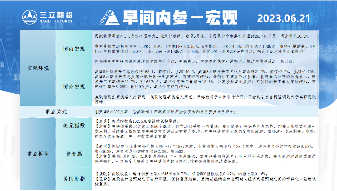 三立期货6月21日早间内参——宏观