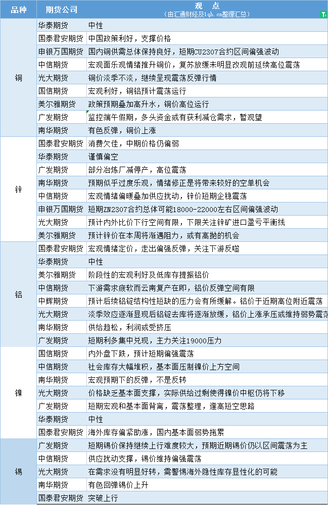 期货公司观点汇总一张图:6月19日有色系(铜、锌、铝、镍、锡等)
