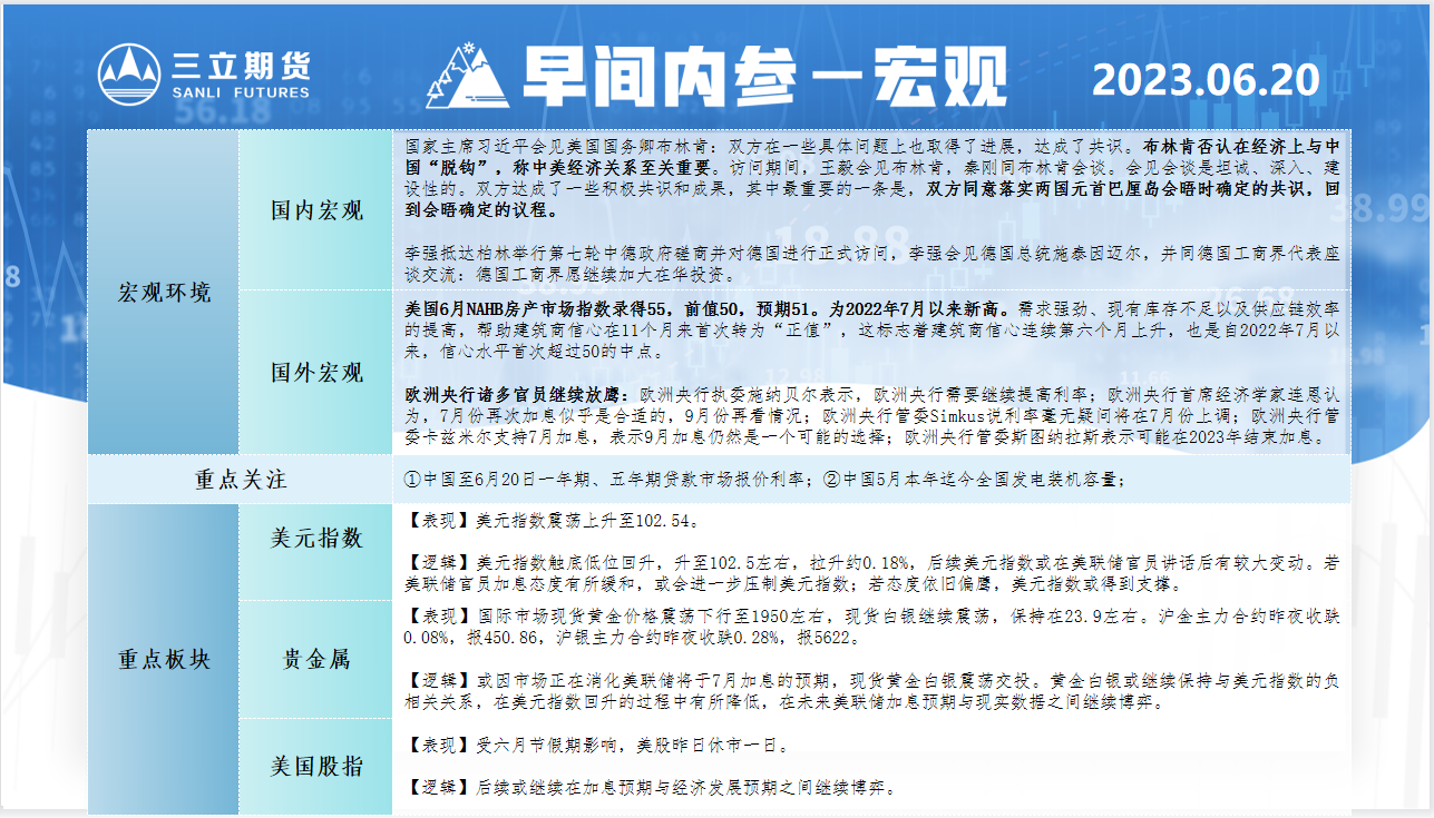 三立期货6月20日早间内参——宏观