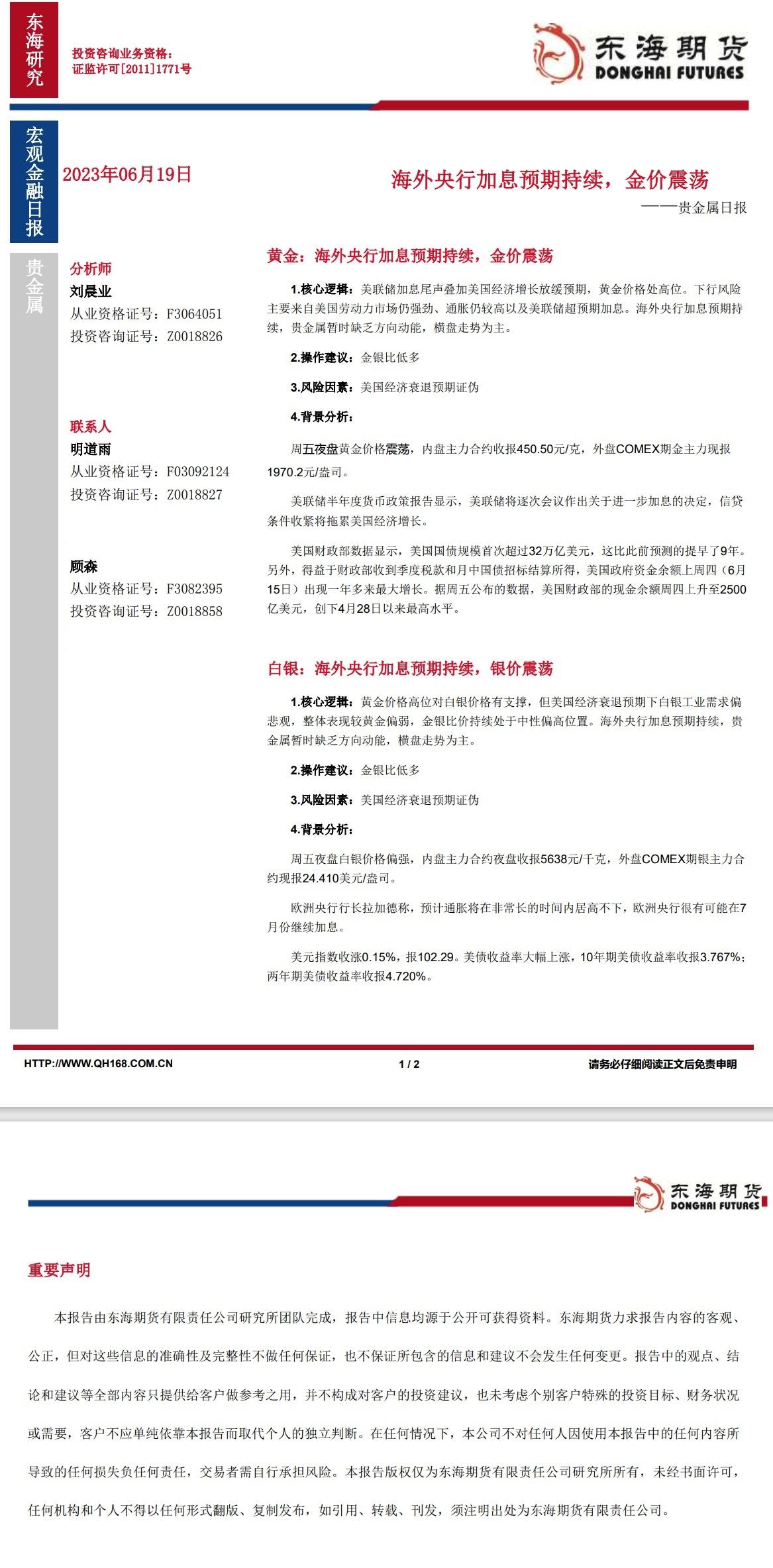 【东海期货6月19日产业链日报】贵金属篇:海外央行加息预期持续,金价震荡