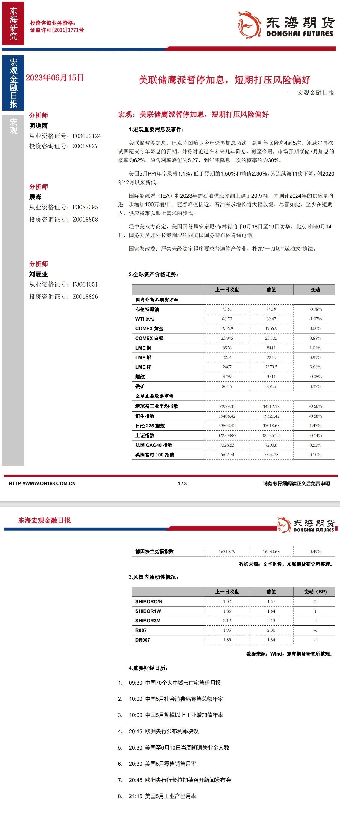 【东海期货6月15日宏观金融日报】:美联储鹰派暂停加息,短期打压风险偏好