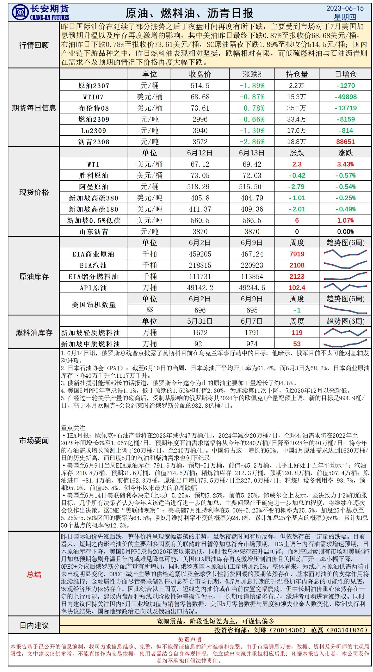 长安期货6月15日原油早评:暂停加息如期而至,库存激增限制涨幅