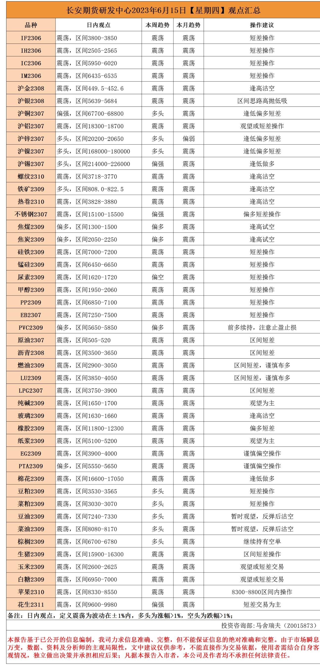 长安期货6月15日早间看盘