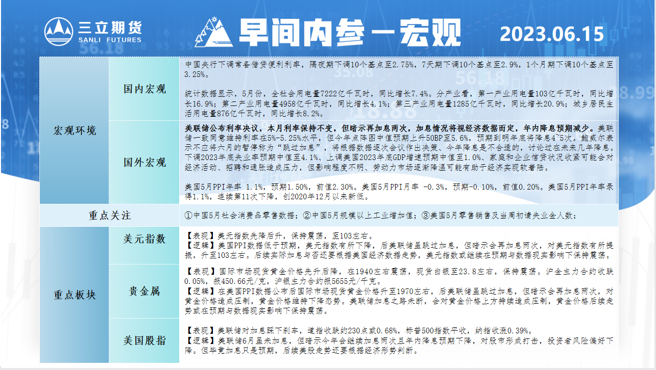 三立期货6月15日早间内参——宏观