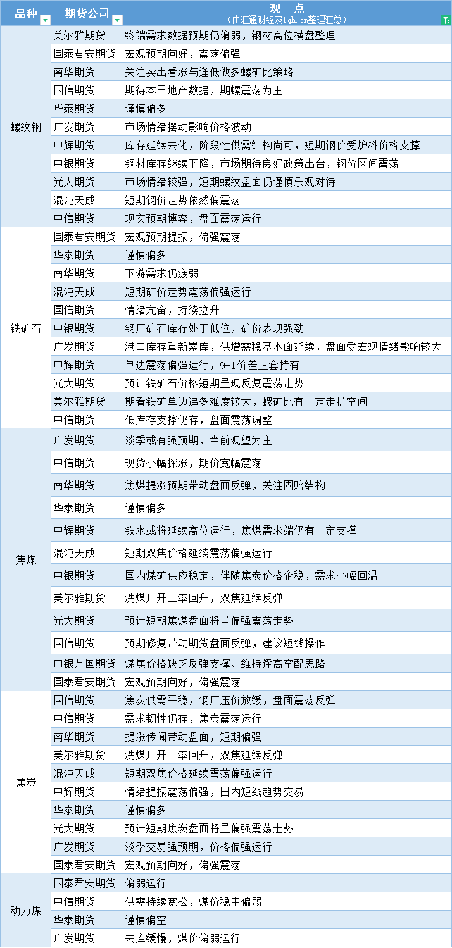 期货公司观点汇总一张图:6月15日黑色系(螺纹钢、焦煤、焦炭、铁矿石、动力煤等)
