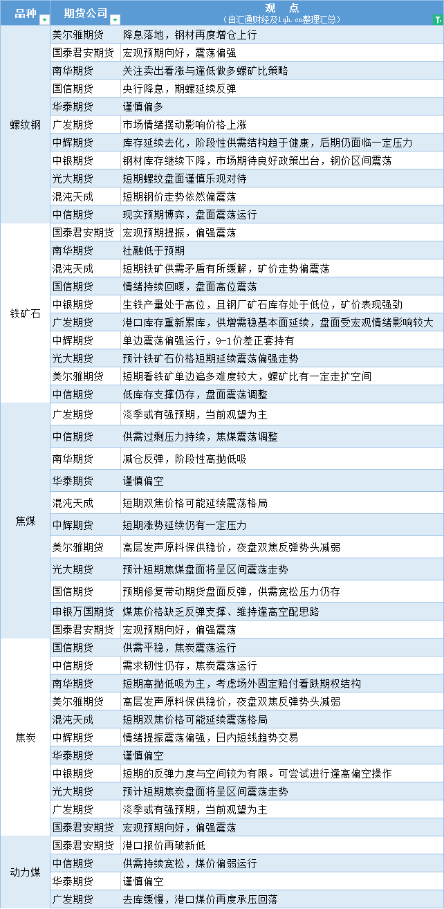期货公司观点汇总一张图:6月14日黑色系(螺纹钢、焦煤、焦炭、铁矿石、动力煤等)