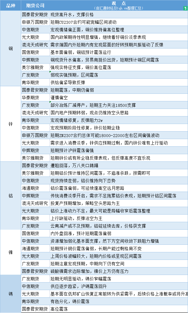期货公司观点汇总一张图:6月7日有色系(铜、锌、铝、镍、锡等)