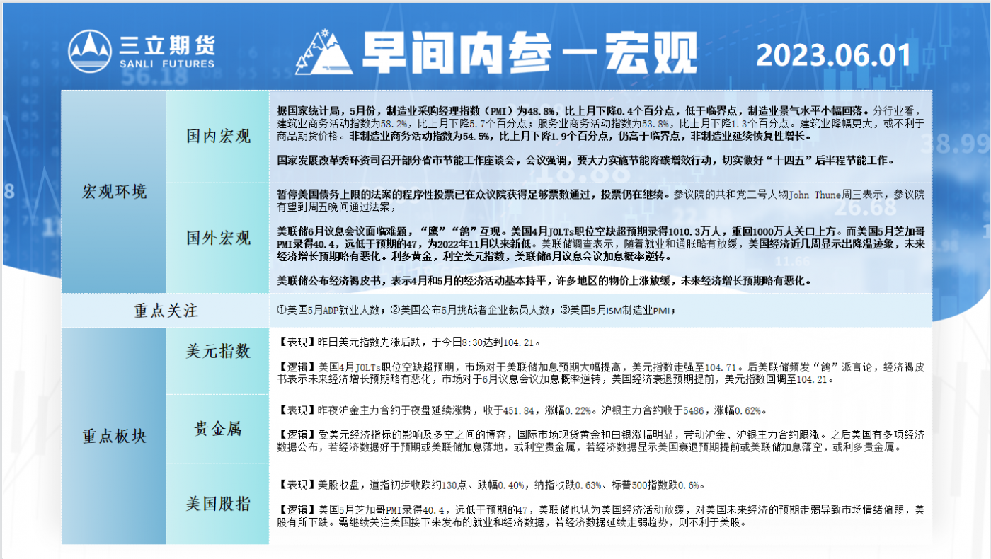 三立期货6月1日早间内参——宏观