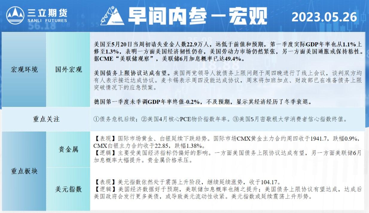 【东海期货5月26日宏观金融日报】:美国债务上限接近达成协议,提振市场情绪