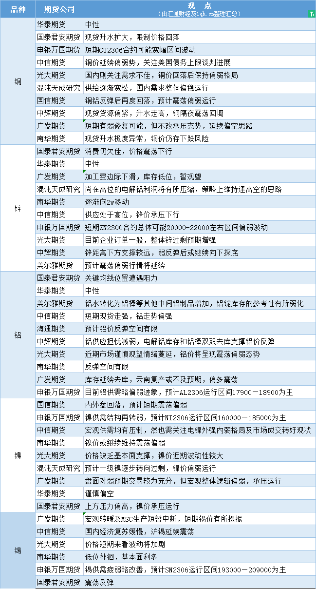 期货公司观点汇总一张图:5月19日有色系(铜、锌、铝、镍、锡等)